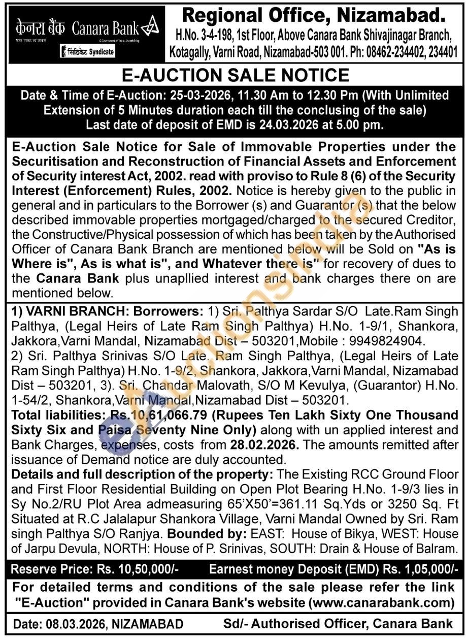 Details and full description of the property: The Existing RCC Ground Floor and First Floor Residential Building on Open Plot Bearing H.No. 1-9/3 lies in Sy No.2/RU Plot Area admeasuring 65'X50'=361.11 Sq. Yds or 3250 Sq. Ft Situated at R.C Jalalapur Shankora Village, Varni Mandal Owned by Sri. Ram singh Palthya S/O Ranjya. Bounded by: EAST: House of Bikya, WEST: House of Jarpu Devula, NORTH: House of P. Srinivas, SOUTH: Drain & House of Balram