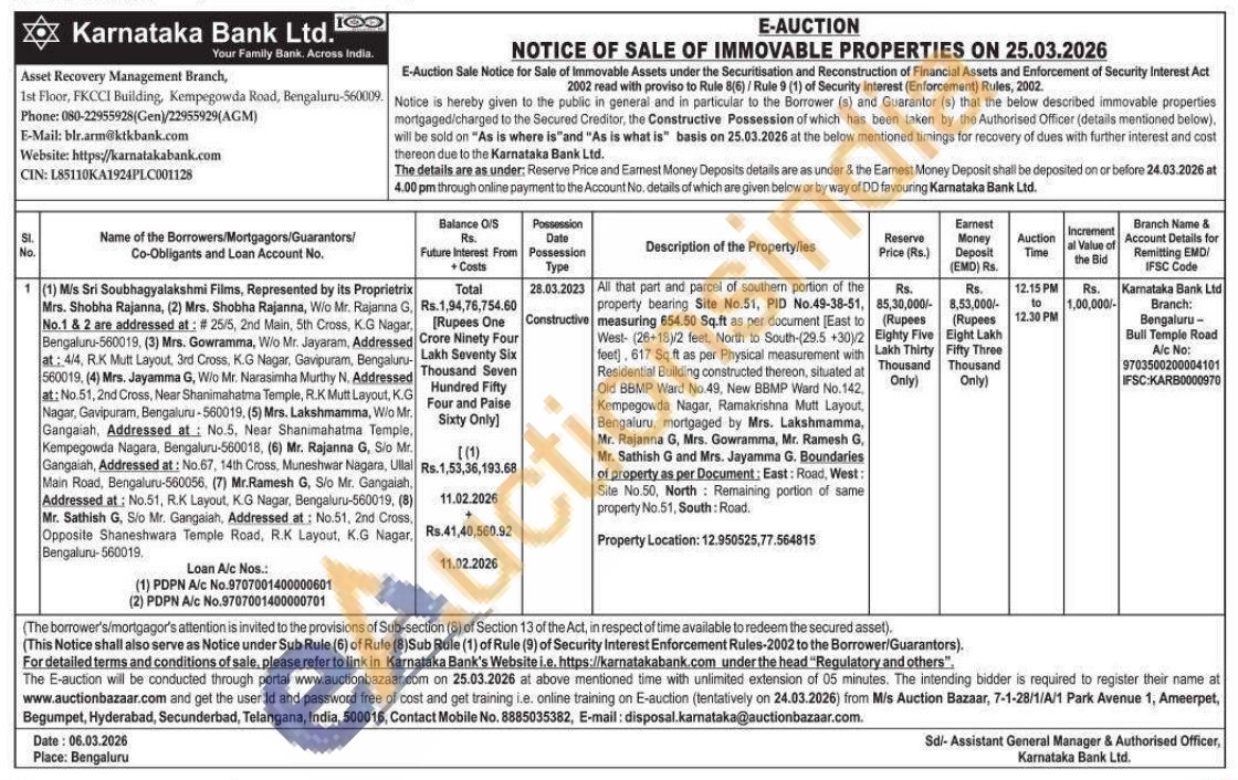 All that part and parcel of southern portion of the property bearing Site No.51, PID No.49-38-51, measuring 654.50 Sq.ft as per document [East to West- (26+18)/2 feet, North to South-(29.5 +30)/2 feet), 617 Sq.ft as per Physical measurement with Residential Building constructed thereon, situated at Old BBMP Ward No.49, New BBMP Ward No.142. Kempegowda Nagar, Ramakrishna Mutt Layout, Bengaluru, mortgaged by Mrs. Lakshmamma, Mr. Rajanna G, Mrs. Gowramma, Mr. Ramesh G. Mr. Sathish G and Mrs. Jayamma G. Boundaries of property as per Document: East: Road, West: Site No.50, North Remaining portion of same property No.51, South: Road