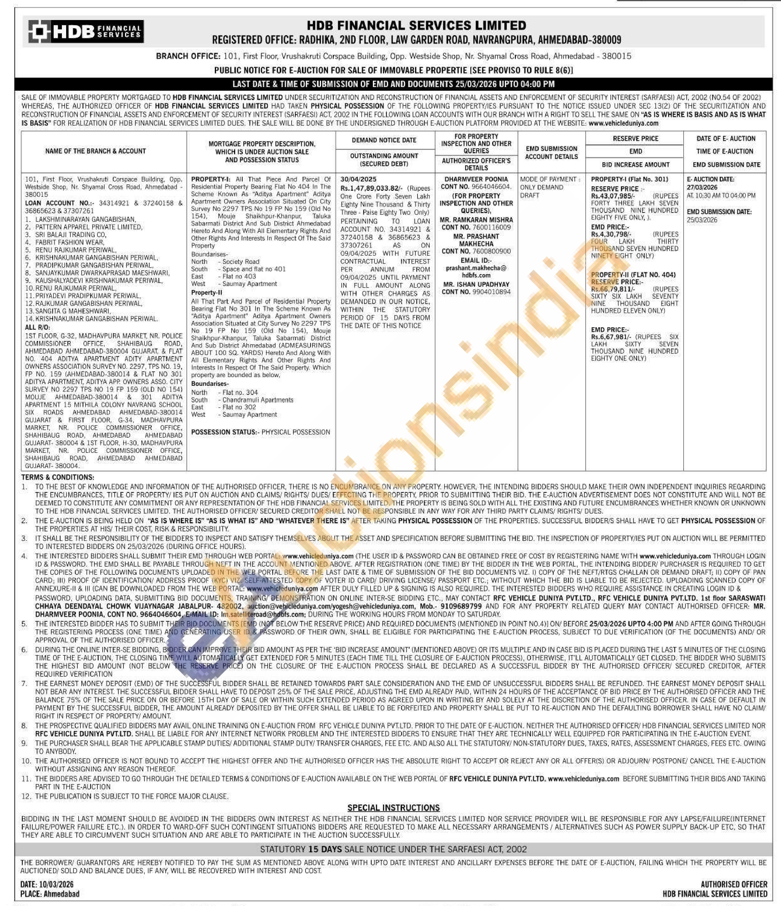 All That Part And Parcel of Residential Property Bearing Flat No 301 In The Scheme Known As "Aditya Apartment" Aditya Apartment Owners Association Situated at City Survey No 2297 TPS No 19 FP No 159 (Old No 154), Mouje Shaikhpur-Khanpur, Taluka Sabarmati District And Sub District Ahmedabad (ADMEASURINGS ABOUT 100 SQ. YARDS) Hareto And Along With All Elementary Rights And Other Rights And Interests In Respect Of The Said Property. Which property are bounded as below,