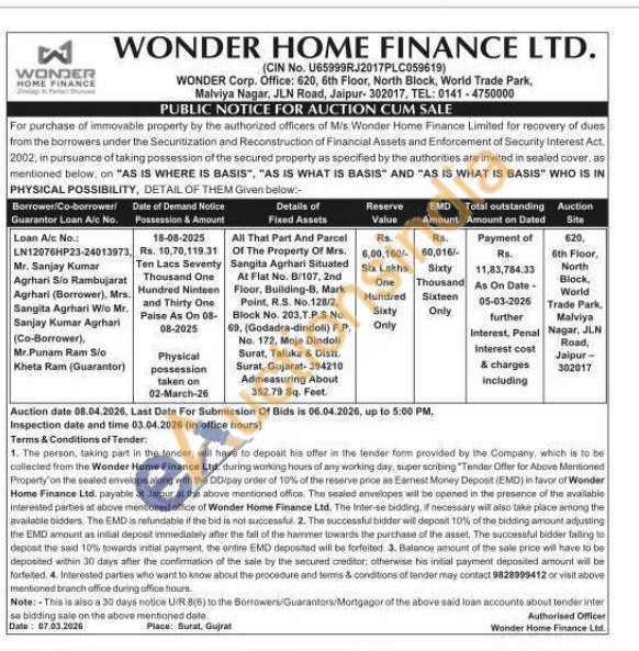 All That Part And Parcel Of The Property Of Mrs. Sangita Agrhari Situated At Flat No. 8/107, 2ndFloor, Building-B, Mark Point, R.S. No. 128/2, Block No. 203.T.P.S No. 69, (Godadra-dindoli) F.P. No. 172, Moje Dindoli Surat, Taluka & Distt. Surat, Gujarat-394210 Admeasuring About352.79 Sq. Ft