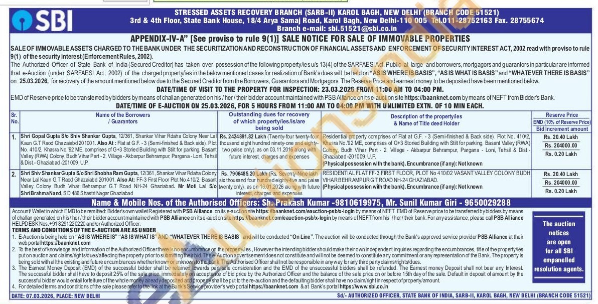 Residential property comprises of Flat at GF-3 (Semi-finished & Back side), Plot No. 410/2, Khasra No.92 ME. comprises of G+3 Storied Buliding with Stilt for parking, Basant Valley (RWA) Colony, Buch Vihar Part 2, Village Akbarpur Behrampur, Pargana Loni, Tehsil & Dist.-Ghaziabad-201009. U.P.