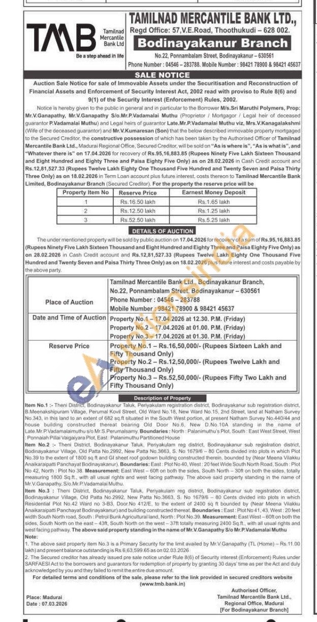 Item No.1 Theni District, Bodinayakanur Taluk Perlyakutan registration disinct, Bodinayakanur sub registration district. BMeenakshipuram Village, Perumal Kovil Street. Old Ward No. 18, New Ward No.15. 2nd Street, land at Natham Survey No 343, in this land to an extent of 682 sq ft situated in the South West portion, at present Natham Survey No.440/44 and house bruliding constructed thereat bearing Old Door No.fl. New D.No. 10A standing in the name of Late Mr.P. Vartamataimuthu s/o Mr S Penumatsamy Boundaries: North Palanimuthu's Plot, South East West Street, West Ponnaiah Pillai Vagaiyara Plot, East: Palanimuthu Partitioned House
