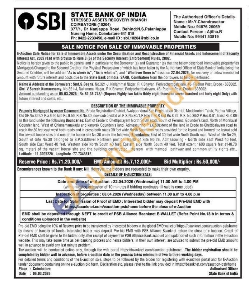 Property Mortgaged by as per Document No. Erode Registration District, Avalpoondura Sub Registration District, Modakurichi Taluk, Pudhur Village, Old SF.No.326/2 P.a.6.90 kist Rs.9.50, R.S.No.30, now sub divided as R.S.No.30/1, P.Hec 2.60.0 kist Rs.8.79, R.S. No. 30/2 P.Hec 0.01.5 kist Rs.0.06 In this land under the following Boundaries: East of Erode to Chettipalayam North South road, South of Perumal Gounder's land, North of Monnaval Gounder land, West of Chinnamanakadu and karuvak Gounden's land. Admeasuring P.a.6.50extent of the land in Erode to Chettipalayam road to reach the 30 feet east west both roads and in cross both roads 30 feet wide North South two roads provided for the layout and formed the layout sold the several house sites and one of the house site No:30 under the following Boundaries: East of 30 feet wide North South road, West of site No:29, South of Site No.30 belonged to S.P.Sakthivel Northern portion, North of Site No.28, Admeasuring North side East West 40 feet, South side East West 40 feet, Western side North South 40 feet, Eastern side North South 40 feet. Total extent 1600 square feet (148.70) sq. meter) of the vacant house site and the building constructed thereon with mamool pathway and common utility rights etc.. Latitude-11.309722N, Longitude -77.734361E.