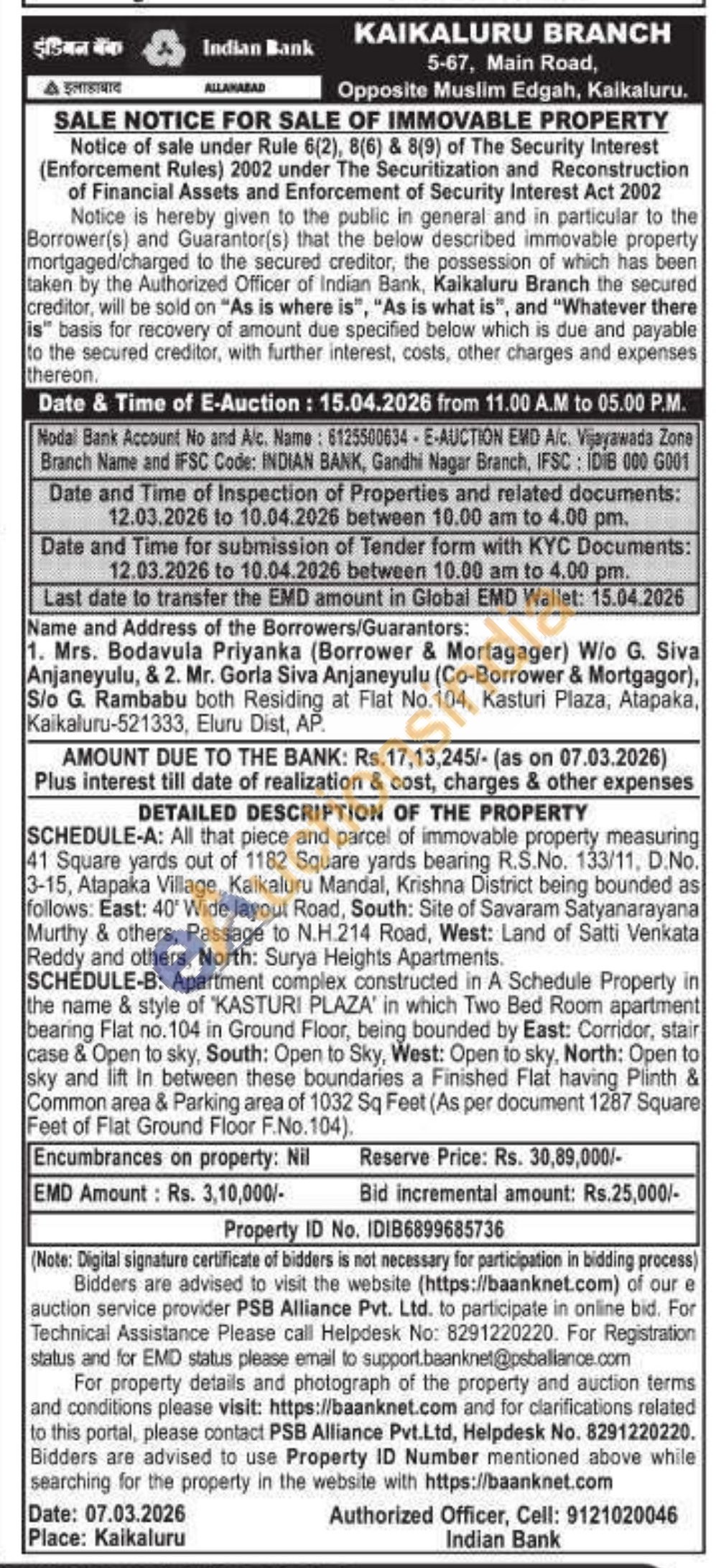 the name & style of 'KASTURI PLAZA' in which Two Bed Room apartment bearing Flat no. 104 in Ground Floor, being bounded by East: Corridor, stair case & Open to sky, South: Open to Sky, West: Open to sky, North: Open to sky and lift In between these boundaries a Finished Flat having Plinth & Common area & Parking area of 1032 Sq Feet (As per document 1287 Square Feet of Flat Ground Floor F.No.104).