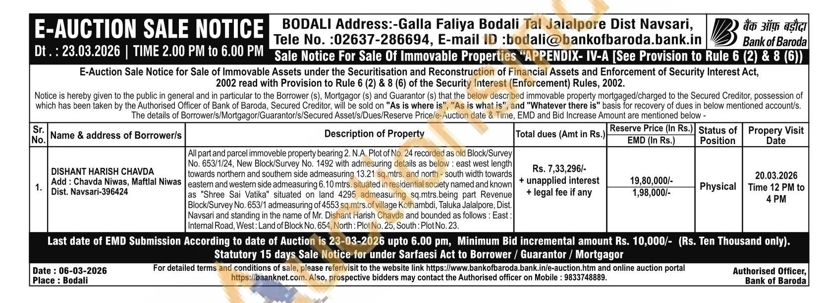 All part and parcel immoveble property bearing 2. N.A. Plot of No. 24 recorded as old Block/Survey No. 653/1/24, New Block/Survey No. 1492 with admesuring details as below: east west length towards northern and southem side admeasuring 13.21 sq.mtrs. and north-south width towards eastern and western side admeasuring 6. 10 mtrs. situated in residential society named and known as "Shree Sai Vatika" situated on land 4295 admeasuring sq.mtrs.being part Revenue Block/Survey No. 653/1 admeasuring of 4553 sq.mtrs.of village Kothambdi, Taluka Jalalpore, Dist. Navsari and standing in the name of Mr. Dishant Harish Chavda and bounded as follows: East: Internal Road, West: Land of Block No. 654, North: Plot No. 25, South: Plot No. 23.