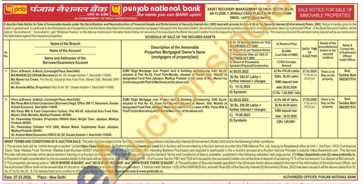 EQM/ Regd Mortgage over Project land & Building admeasuring 3300 Sqmt. situated at Plot No. 43. Food Park-Mandia, situated in Maneri, Dist. Mandia (A designated Food Park Jabalpur, Madhya Pradesh in the name of Mis. Paras Milk & Food Corporation along with Plant & Machinery at the above unit.