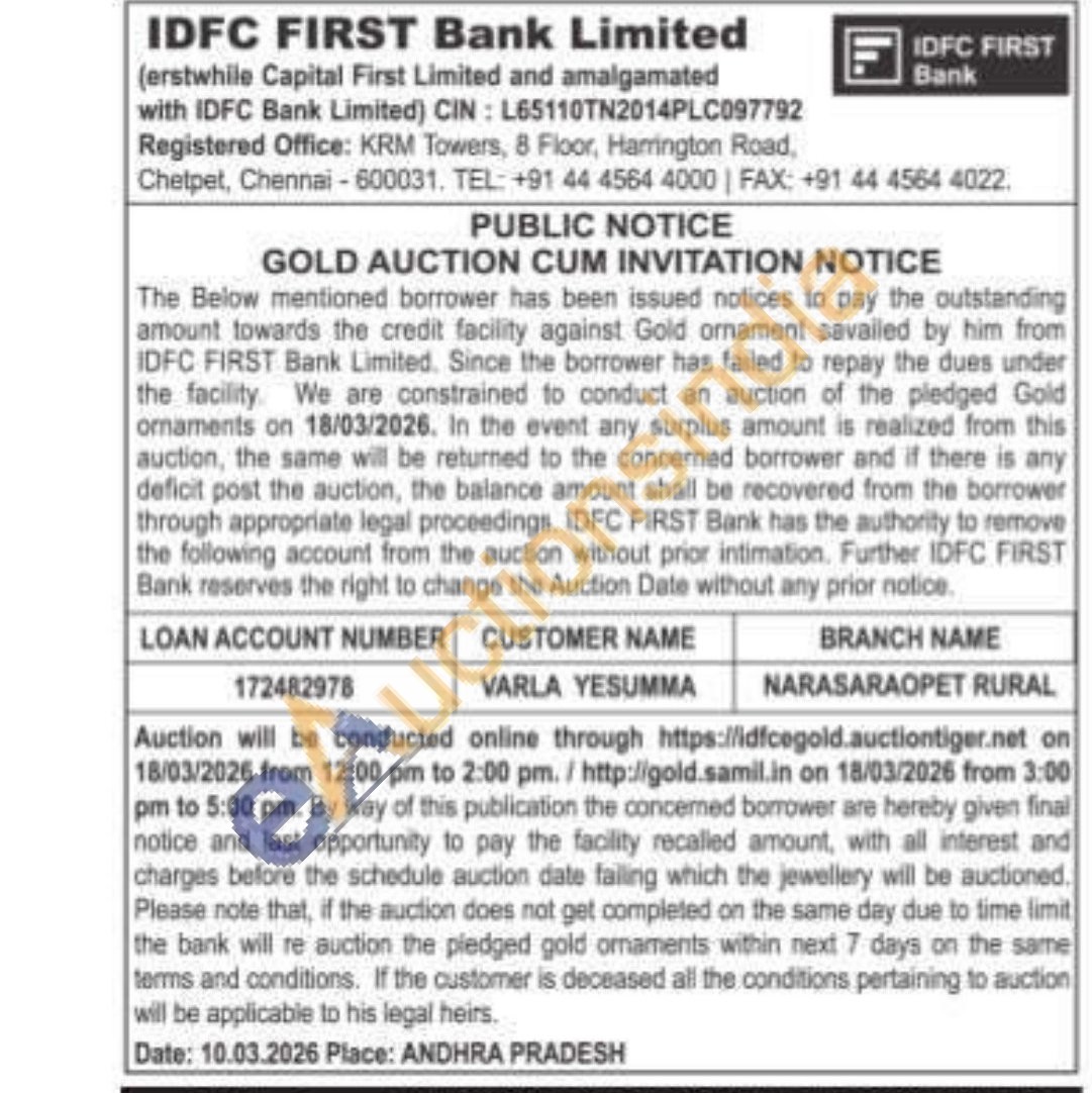 IDFC First Bank Ltd Gold Auctions Auction in Guntur