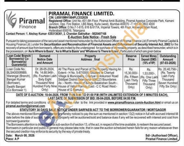 All The Piece and Parcel of The Property Having An Extent:- H No. 5-87/0000, Situated at Cheriyal Village & Municipality, Cheriyal to Ankunoor Road Siddipet District Telangana-506223 Boundaries As-North: House of Banda Balakishan South:-House of Valluri Ramulu East-CC Road West: House of G Ramulu