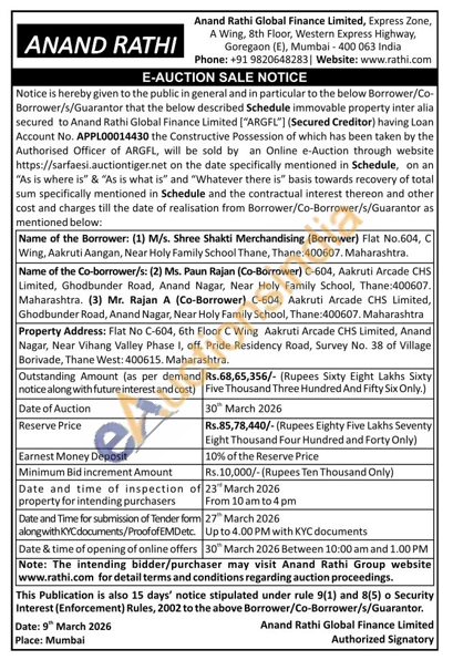 Flat No C-604, 6th Floor C Wing Aakruti Arcade CHS Limited, Anand Nagar, Near Vihang Valley Phase I, off. Pride Residency Road, Survey No. 38 of Village Borivade, Thane West: 400615. Maharashtra