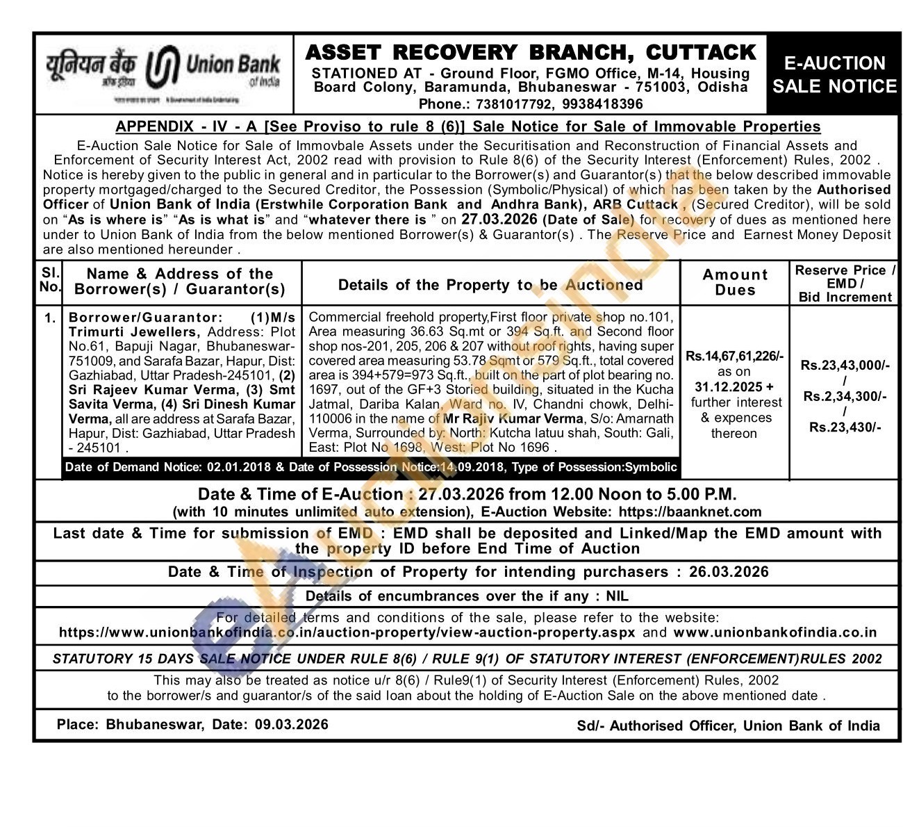 Commercial freehold property, First floor private shop no.101, Area measuring 36.63 Sq.mt or 394 Sq.ft. and Second floor shop nos-201, 205, 206 & 207 without roof rights, having super covered area measuring 53.78 Sqmt or 579 Sq.ft., total covered area is 394+579-973 Sq.ft., built on the part of plot bearing no. 1697, out of the GF+3 Storied building, situated in the Kucha Jatmal, Dariba Kalan, Ward no. IV, Chandni chowk, Delhi-110006 in the name of Mr Rajiv Kumar Verma, S/o: Amarnath Verma, Surrounded by: North: Kutcha latuu shah, South: Gali, East: Plot No 1698, West: Plot No 1696.