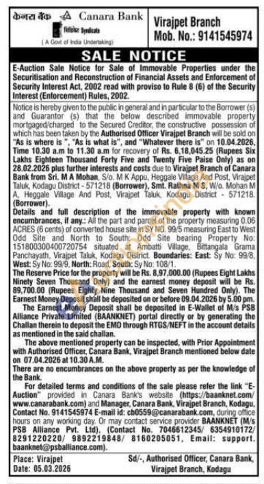 All the part and parcel of the property measuring 0.06 ACRES (6 cents) of converted house site in SY NO. 99/5 measuring East to West Odd Site and North to South: Odd Site bearing Property No: 151800300400720754 situated at Ambatti Village, Bittangala Grama Panchayath, Virajpet Taluk, Kodagu District. Boundaries: East: Sy No: 99/8, West: Sy No: 99/9, North: Road, South: Sy No: 108/1