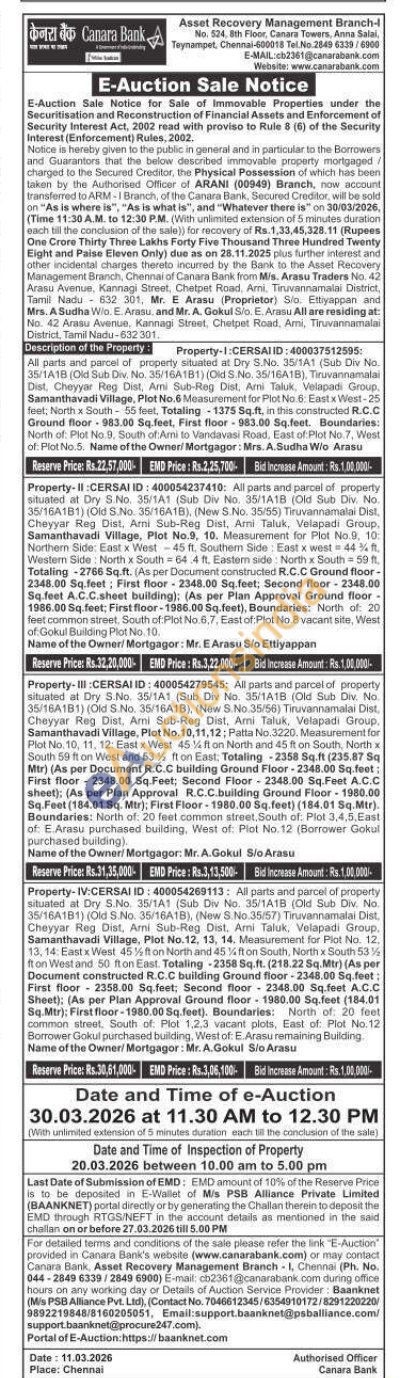 1) All parts and parcel of property situated at Dry S.No. 35/1A1 (Sub Div No. 35/1A1B (Old Sub Div. No. 35/16A1B1) (Old S.No. 35/16A1B), Tiruvannamalai Dist, Cheyyar Reg Dist, Arni Sub-Reg Dist, Ami Taluk, Velapadi Group, Samanthavadi Village, Plot No.6 Measurement for Plot No.6: East x West-25 feet; North x South-55 feet, Totaling1375 Sq.ft, in this constructed R.C.C Ground floor 983.00 Sq.feet, First floor-983.00 Sq.feet. Boundaries: North of: Plot No.9, South of Arni to Vandavasi Road, East of Plot No.7, West of: Plot No.5. Name of the Owner/Mortgagor: Mrs. A. Sudha W/o Arasu