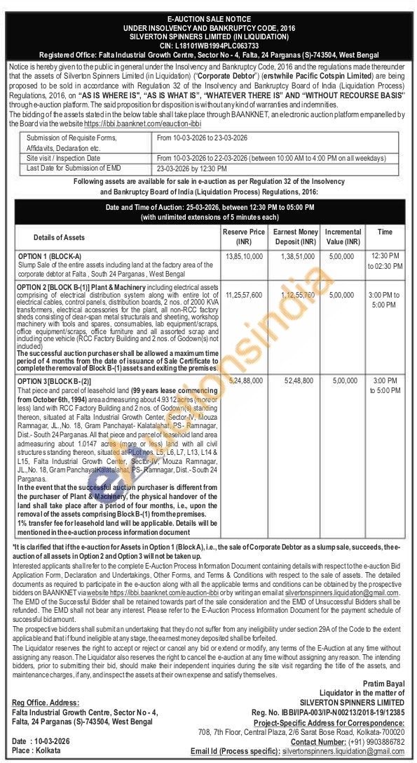 OPTION 2 [BLOCK B-(1)] Plant & Machinery including electrical assets comprising of electrical distribution system along with entire lot of electrical cables, control panels, distribution boards, 2 nos. of 2000 KVA transformers, electrical accessories for the plant, all non-RCC factory sheds consisting of dear-span metal structurals and sheeting, workshop machinery with tools and spares, consumables, lab equipment/scraps, office equipment/scraps, office furniture and all assorted scrap and induding one vehicle (RCC Factory Building and 2 nos. of Godown(s) not included) The successful auction purchaser shall be allowed a maximum time period of 4 months from the date of issuance of Sale Certificate to complete the removal of Block B-(1) assets and exiting the premises
