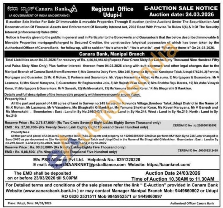 All the part and parcel of 4.80 acres of land in Survey no 245 located in Navunda Village, Byndoor Taluk, Udupi District in the Name of Mr.K Mohan, Mr Laxmana, Mr V Vasudeva, Ms Bhagirathi G Mankikar, Ms Yamuna Shekhar Korar, Ms Kaveri Narayana, Mr V Ganesh and Ms Meenakshi Boundaries: East: Land in Sy No.246/243/1, South: Land in Sy No.244, West: Land in Sy No.219, North: Land in Sy No.219