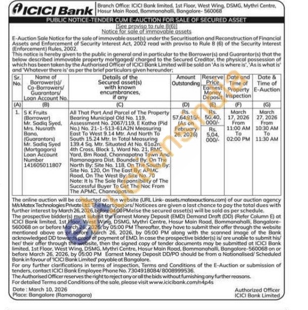 All That Part And Parcel of The Property Bearing Municipal Old No. 119. Assessment No. 2067/119, E Katha (Pid No.) No. 21-1-513-61A2N Measuring East To West 9.14 Mtr. And North To South 15.24 Mtr. In Total Measuring 139.4 Sq. Mtr. Situated At No. 61021, 4th Cross, Block 1, Ward No. 21, RMC Yard, Bm Road, Channapatna Town And Ramanagara Dist. Bounded By: On The North By: Site No. 118, On The South By: Site No. 120, On The East By: APMC Road, On The West By: Site No. 70 Note: It Is The Sole Responsibility of The Successful Buyer To Get The Noc From The APMC, Channapatna.