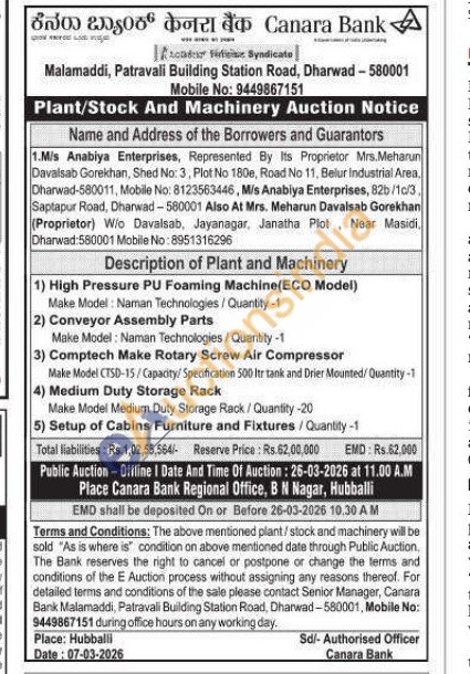 1) High Pressure PU Foaming Machine (ECO Model) Make Model: Naman Technologies/ Quantity -1 2) Conveyor Assembly Parts Make Model: Naman Technologies/Quantity-1 3) Comptech Make Rotary Screw Air Compressor Make Model CTSD-15/Capacity: Specification 500 Itr tank and Drier Mounted/Quantity -1 4) Medium Duty Storage Rack Make Model Medium Duty Storage Rack/Quantity-20 5) Setup of Cabins Furniture and Fixtures/Quantity-1