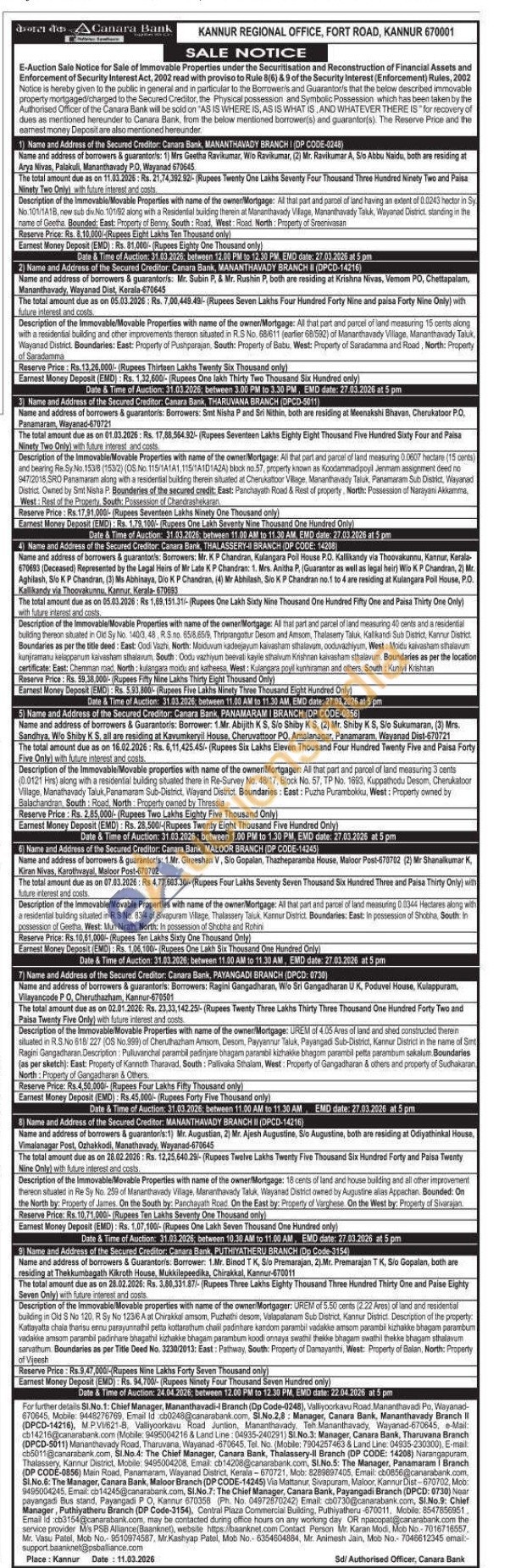 Contact Manager, Canara Bank, Tharuvana Tel. No. (Mobile: 7904257463 & Land Line: 04935-230300),