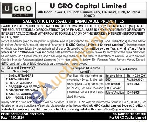 First floor with roof rights, ad-measuring 420 sq. ft. (i.e. built No. 1E-15, B-P., New Township an Shop Nos. 4&5) Part of Plot Faridabad, Tehsil & Distt. Farid-abad, Haryana,