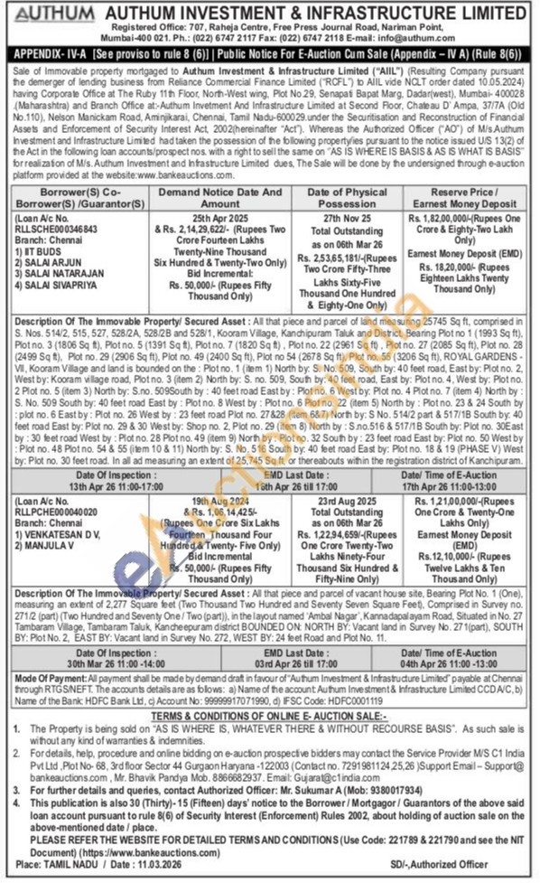 Description Of The Immovable Property/ Secured Asset: All that piece and parcel of land measuring 25745 Sq ft, comprised in 5. Nos. 514/2, 515, 527, 528/2A, 528/28 and 528/1, Kooram Village, Kanchipuram Taluk and District, Bearing Plot no 1 (1993 Sq ft), Plot no. 3 (1806 Sq ft), Plot no. 5 (1391 Sq ft), Plotno. 7 (1820 Sq ft), Plot no. 22 (2961 Sq ft), Plot no. 27 (2085 Sq ft), Plot no. 28 (2499 Sq ft), Plot no. 29 (2906 Sq ft), Plot no. 49 (2400 Sq ft), Plot no 54 (2678 Sq ft), Plot no. 55 (3206 Sq ft), ROYAL GARDENS-VII, Kooram Village and land is bounded on the: Plot no. 1 (item 1) North by. S. No. 509, South by: 40 feet road, East by: Plot no. 2, West by: Kooram village road, Plot no. 3 (item 2) North by: S. no. 509, South by: 40 feet road, East by: Plot no. 4. West by: Plot no. 2 Plot no. 5 (item 3) North by: S.no. 509South by: 40 feet road East by: Plot no. 6 West by. Plot no. 4 Plot no. 7 (item 4) North by: S. No. 509 South by: 40 feet road East by: Plot no. 8 West by: Plot no. 6 Plot no. 22 (item 5) North by: Plot no. 23 & 24 South by plot no. 6 East by: Plot no. 26 West by: 23 feet road Plot no. 27828 (item 687) North by: S No. 514/2 part & 517/18 South by: 40 feet road East by: Plot no. 29 & 30 West by: Shop no. 2. Plot no. 29 (item 8) North by: Sno.516 & 517/18 South by: Plot no. 30East by: 30 feet road West by: Plot no. 28 Plot no. 49 (item 9) North by: Plot no. 32 South by: 23 feet road East by: Plot no. 50 West by Plot no. 48 Plot no. 54 & 55 (item 10 & 11) North by. S. No. 516 South by: 40 feet road East by: Plot no. 18 & 19 (PHASE V) West by: Plot no. 30 feet road. In all ad measuring an extent of 25,745 Sq ft, or thereabouts within the registration district of Kanchipuram.