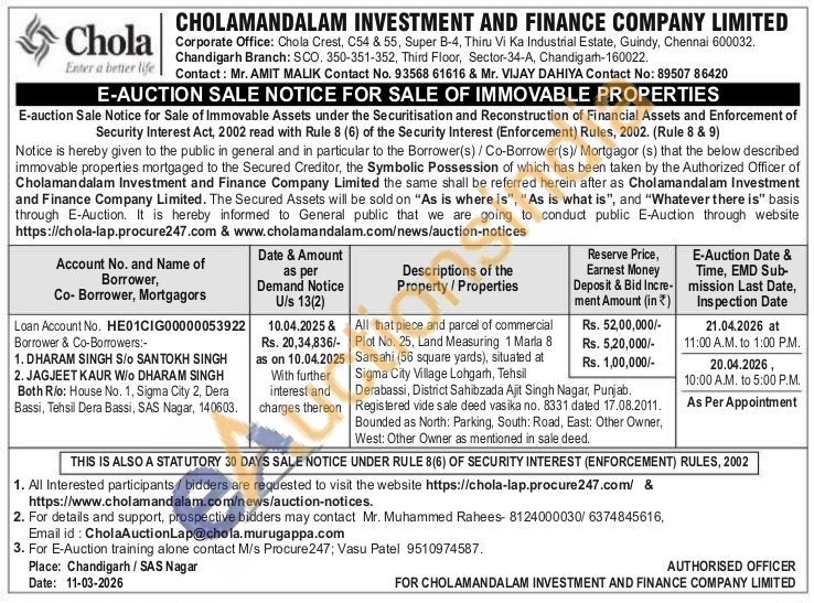All that piece and parcel of commercial Plot No. 25, Land Measuring 1 Marla 8Sarsahi (56 square yards), situated at Sigma City Village Lohgarh, Tehsil Derabassi, District Sahibzada Ajit Singh Nagar, Punjab. Bounded as North: Parking, South: Road, East: Other Owner, West: Other Owner as mentioned in sale deed. Registered vide sale deed vasika no. 8331 dated 17.08.2011