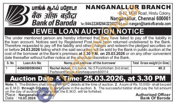 Bank of Baroda Gold Auctions Auction in Chennai
