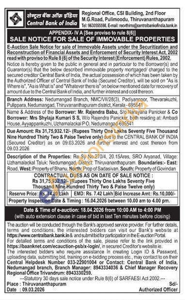 Re Sy No.270/4, 20.15Ares, SRO Aryanad, Village: Uzhamalackal Taluk: Nedumangad, District: Thiruvananthapuram Boundaries:- East: Road. West: Property of Bhanu, North: Prop of Sadasivan, South: Property of Govindan