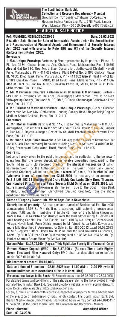 admeasuring 72.93 Sq Mtr (built-up area) along with adjoining terrace area of about 7.62 sq.mts in building 'B' in the 4th floor of the building known as KAMALRAJ DATTA VIHAR constructed over the land admeasuring 1 Hectors 60 Ares bearing Gat No. 194 (Old Gat No. 1312, Old Sy No. 139) at Borhadewadi Village, Haveli Taluk, Pune District owned by Mr. Vinod Appa Sahib Kawachale, more fully described in Agreement for Sale Sr. No. 2850/2013 dated 20.03.2013 of Sub-Registrar Office Haveli No. 8, Pune and the land bounded as follows, North: By 30 ft BRT road East: By remaining land out of Gat No. 194 South: By land of Shamuu Borate West: By Gat No. 195
