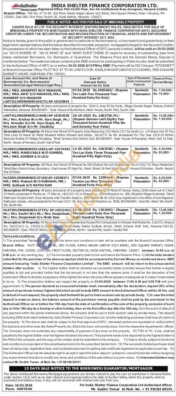 Description Of Property: All piece and parcel of property No. 324/15, Area 50 Sq Yards, Village Sunder Nagar Tohana, District Fatehabad, Haryana. BOUNDARY:- East-House of Sunita Rani, West-House, North-Plot, South Gali