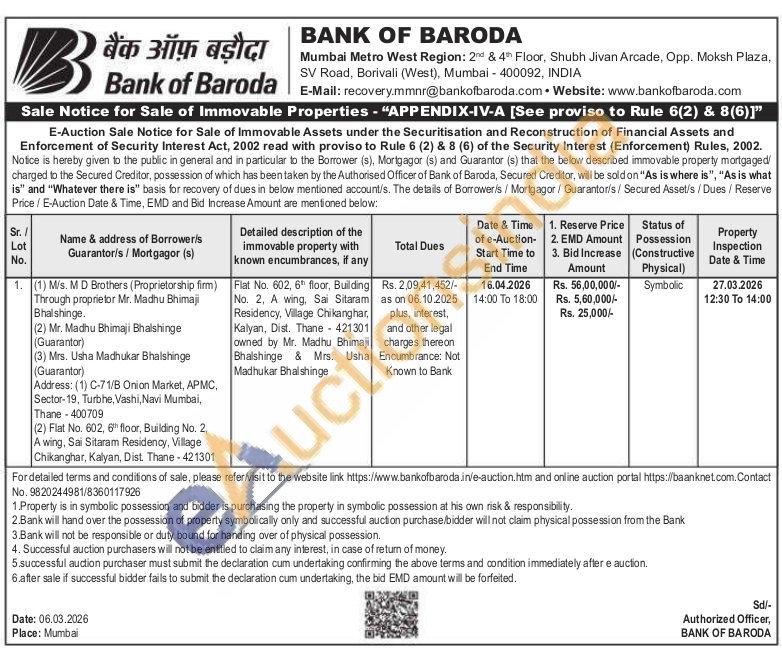 Flat No. 602, 6th floor, Building No. 2, A wing, Sai Sitaram Residency, Village Chikanghar, Kalyan, Dist, Thane - 421301 owned by Mr. Madhu Bhimaji Bhalshinge & Mrs. Usha Madhukar Bhalshinge