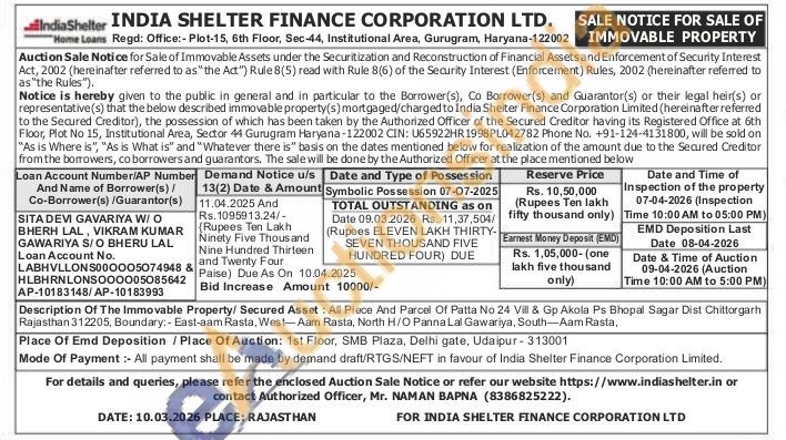 Description Of The Immovable Property/ Secured Asset: All Piece And Parcel Of Patta No 24 Vill & Gp Akola Ps Bhopal Sagar Dist Chittorgarh Rajasthan 312205, Boundary:- East-aam Rasta, West Aam Rasta, North H/O Panna Lal Gawariya, South-Aam Rasta,