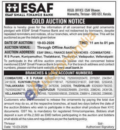 ESAF SMALL FINANCE BANK Gold Auctions Auction in Coimbatore