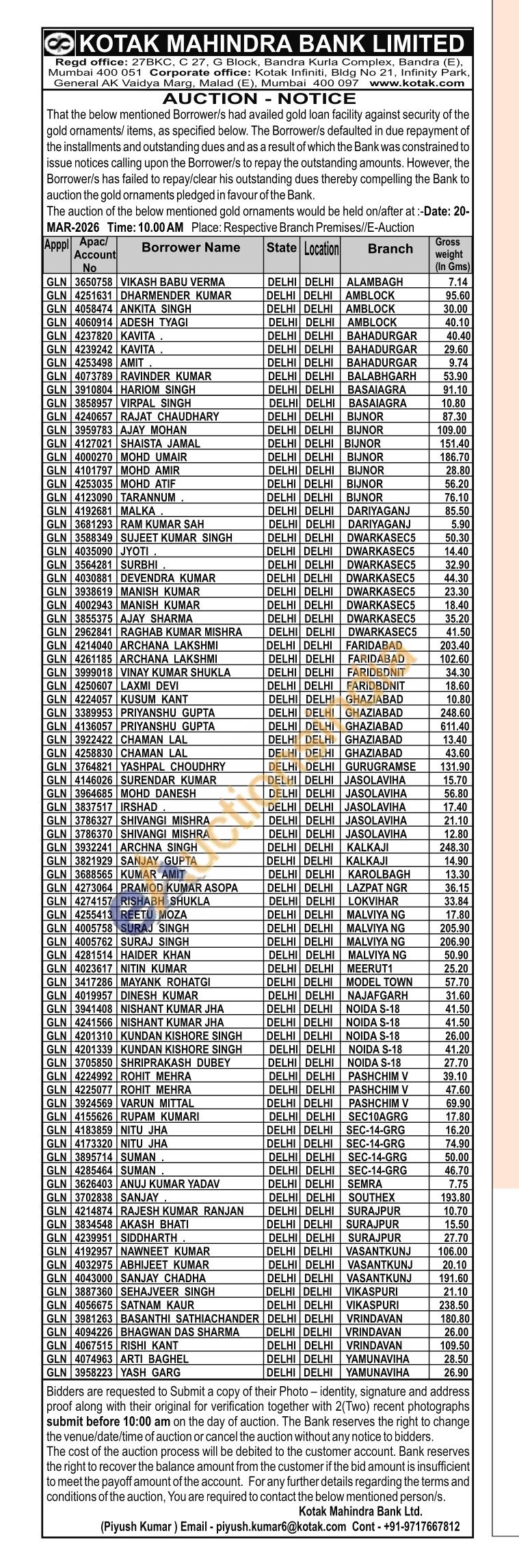 Kotak Mahindra Bank Gold Auctions Auction in New Delhi