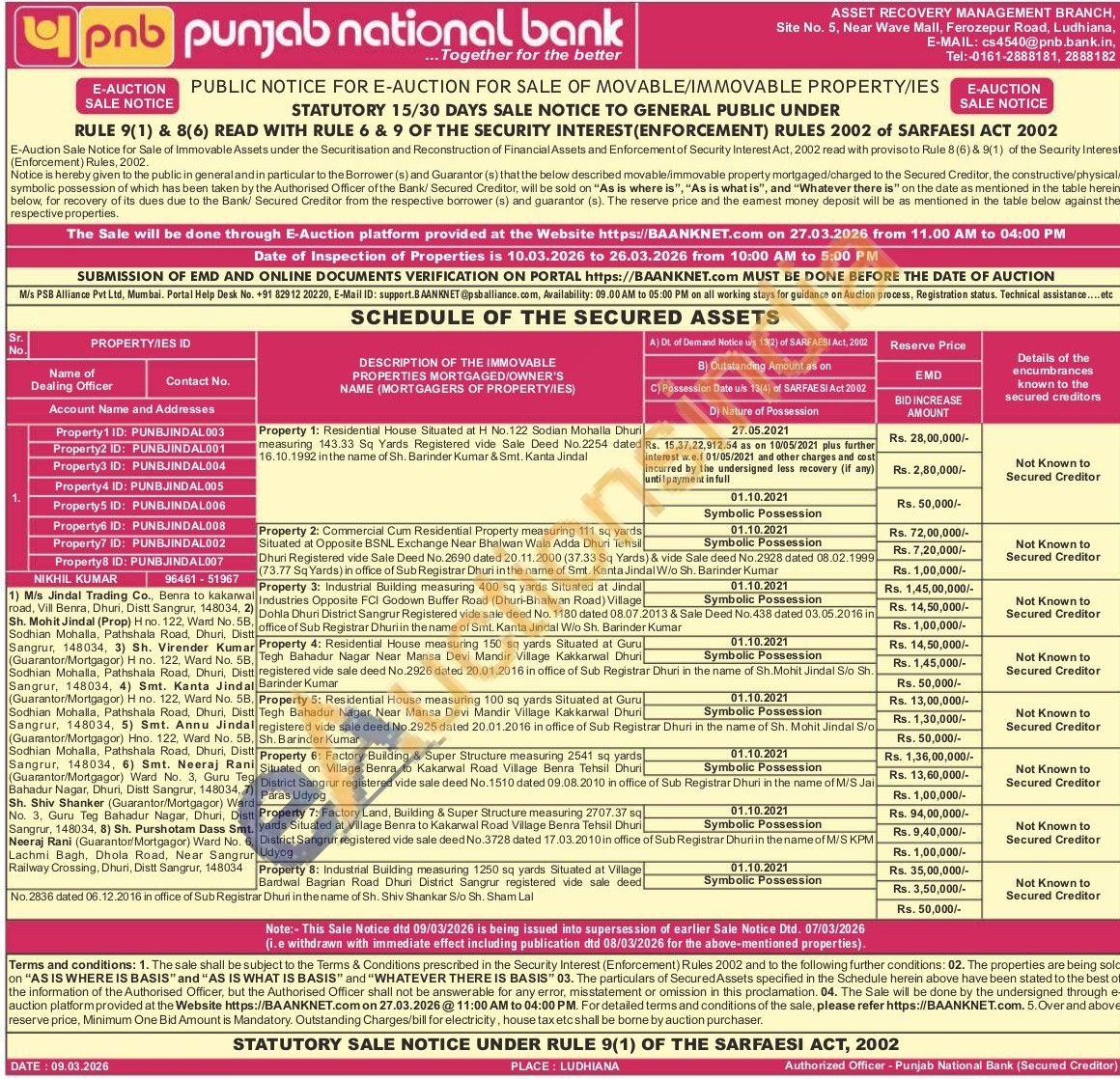 Property 3: Industrial Building measuring 400 sq yards Situated at Jindal Industries Opposite FCI Godown Buffer Road (Dhuri-Bhalwan Road) Village Dohla Dhuri District Sangrur Registered vide sale deed No. 1180 dated 08.07.2013 & Sale Deed No. 438 dated 03.05.2016 in office of Sub Registrar Dhuriin the name of Smt. Kanta Jindal W/o Sh. Barinder Kumar