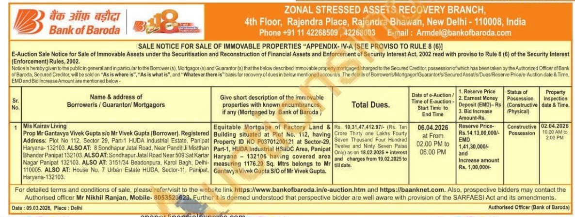 Equitable Mortgage of Factory Land & Building situated at Plot No. 112, having Property ID NO P03701200121 at Sector-29, Part-1, HUDA Industrial HSIIDC Area, Panipat Haryana 132106 having covered area measuring 1176.20 Sq. Mtrs belongs to Mr till date. Gantavya Vivek Gupta S/O of Mr Vivek Gupta