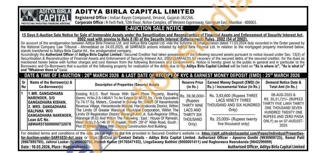 Existing R.C.C. Roof House With Open Place Property, Bearing Gwmc. H.No.2-5-146/A/1 To An Extent Of 88.72 Sq. Yards Equivalent To 74.17 Sq. Meters., Covered In Survey No. 1040/B Of Hanamkonda Revenue Village, Hanamkonda Mandal, Hanumakonda District, Within The Limits Of Greater Warangal Municipal Corporation, Within The Limits Of Registration District Warangal And Jt. Sub-Registrar Office, Warangal (R.O) And Within The Following: East: House Of Ramesh, West: H.No.2-5-146 Of N. Rajaiah, North 28-0" Wide Road, South: Plot Of Others. Along With Existing Construction And Building