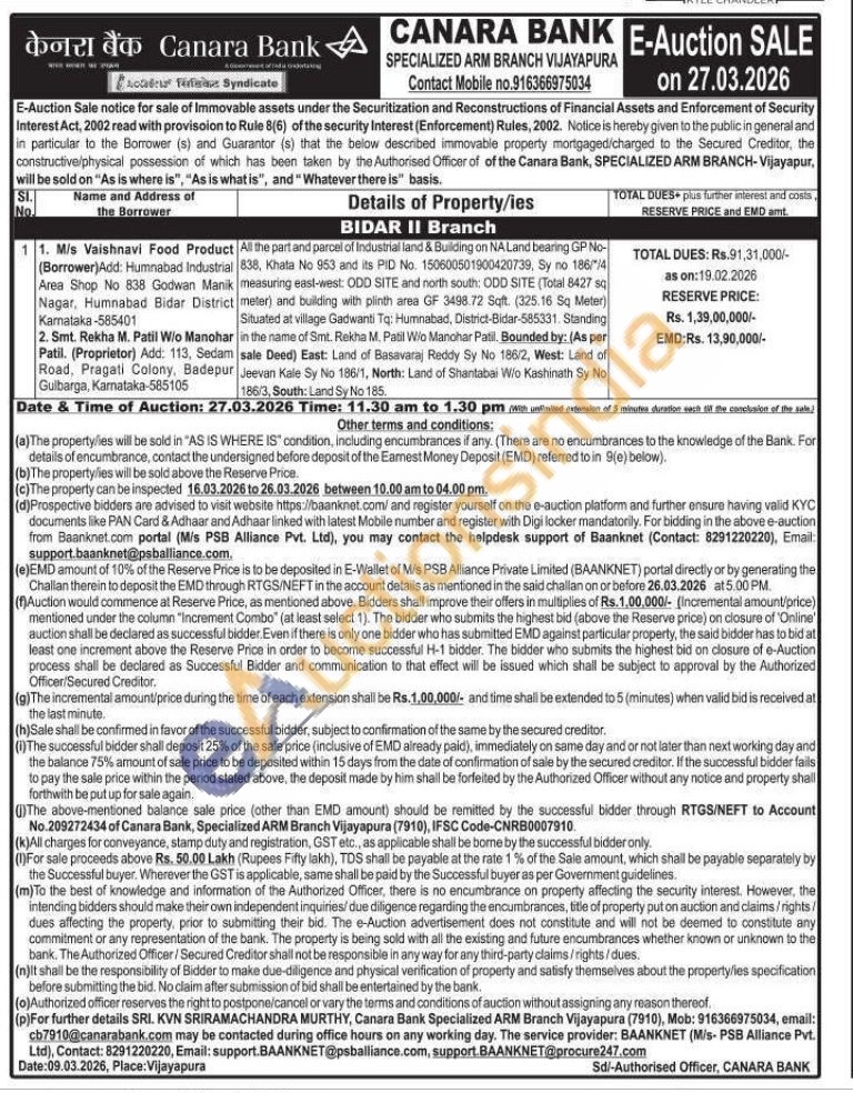 All the part and parcel of Industrial land & Building on NA Land bearing GP No-838, Khata No 953 and its PID No. 150600501900420739, Sy no 186//4 measuring east-west: ODD SITE and north south: ODD SITE (Total 8427 sq meter) and building with plinth area GF 3498.72 Sqft. (325.16 Sq Meter) Situated at village Gadwanti Tq: Humnabad, District-Bidar-585331 Standing in the name of Smt. Rekha M, Patil W/o Manohar Patil. Bounded by: (As per sale Deed) East: Land of Basavaraj Reddy Sy No 186/2, West: Land of Jeevan Kale Sy No 186/1, North: Land of Shantabai Wo Kashinath Sy No 186/3, South: Land Sy No 185.