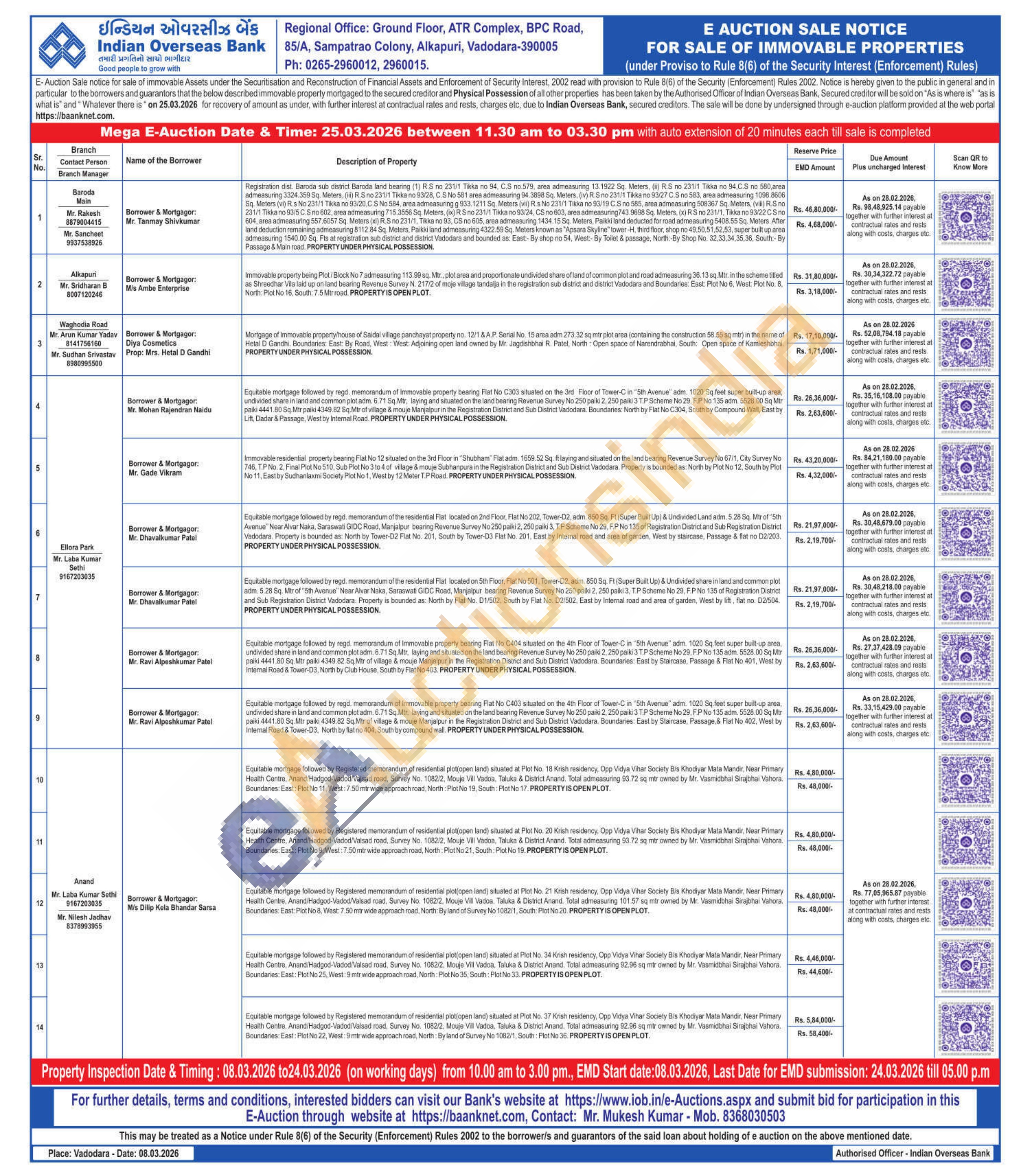 Immovable property being Plot/Block No 7 admeasuring 113.99 sq. Mtr., plot area and proportionate undivided share of land of common plot and road admeasuring 36.13 sq. Mtr. in the scheme titled as Shreedhar Vila laid up on land bearing Revenue Survey N. 217/2 of moje village tandalja in the registration sub district and district Vadodara and Boundaries: East: Plot No 6, West: Plot No. 8. North: Plot No 16, South: 7.5 Mtr road. PROPERTY IS OPEN PLOT.
