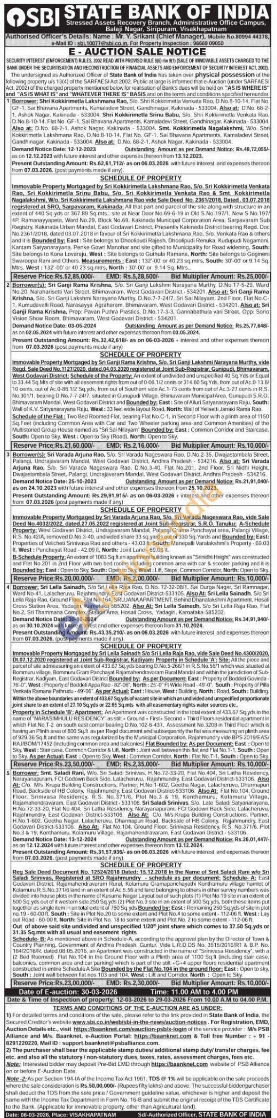 4) : All the piece and parcel of site admeasuring an exterit of 433 67 Sq. yds bearing D.No.5-266/1 in RS.No. 56/1 which was situated at Bommuru village, Bommuru Gram Panchayat Rajamahendravaram Rural Mandal and within the jurisdiction of Sub Registrar, Kadiyam, East Godavari District Bosindest by: As per Document: East: Property of Boddeti Govinda-76-0, West: Property of Boddeti Appa Rao-82-06, North: 25 Ft Wide Road-49-0 South: Property of Pilla Verkata Ramana Pathrudu-49-06 As per Actual; East: Hone, West: Building, North Road, South: Bulding. Within the above boundaries an extent of 433.67 Sq yds of vacant site in which an undivided and unspecified proportionate joint share to an extent of 27.10 Sq.yds or 22.65 Sqmts with all easementary rights water sources etc., Property in Schedule B: Apartment: An Apartment was constructed in the total extent of 433.67 Sq, yds in the name of NARASIMHULU RESIDENCY as stilt Ground First Second Third Floors residential apartment in which Flat No.1-2 on south east comer bearing D No. 102-6-437, Assessment No. 3208 in Third Floor which is having an Plinth area of 800 Sqft as per Regd document and subsequently the flat was measuring an plinth area of 929.36 Sqft and the same was regularized by the Municipal Corporation, Rajahmundry vide BPS 2019/EAS RAJ/BOM/17452 (Including common area and balconies) Flat Bounded by: As per Document: East: Open to Sky West: Stair case. Common Comidor & Lift, North Joint wall between thes flat and Flat No 7-1, South: Open to Sky As per Actual East: Open to Sky West: Common Corridor. North: Flat No.T-1, South: Open