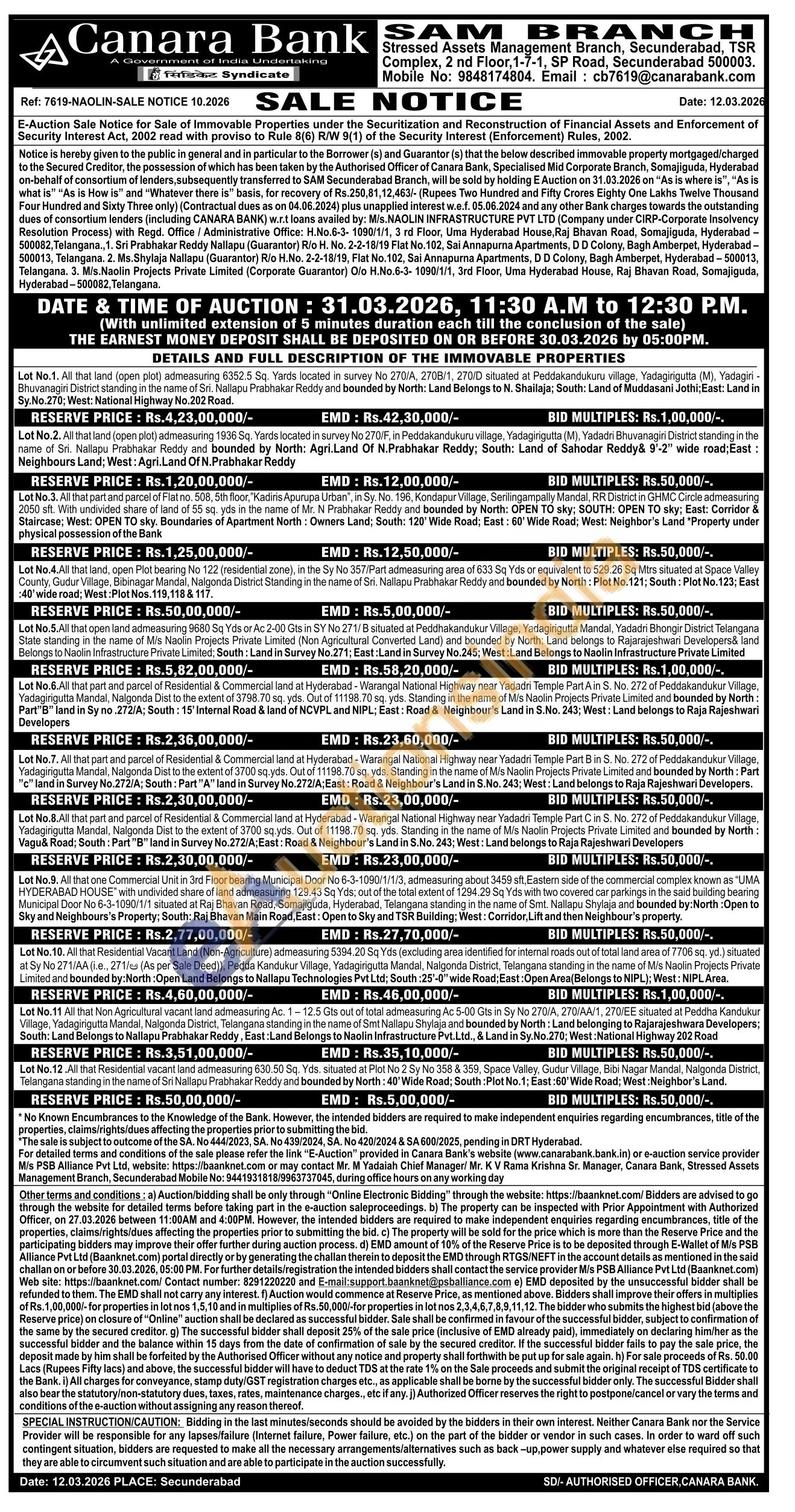 Lot No.7. All that part and parcel of Residential & Commercial land at Hyderabad - Warangal National Highway near Yadadri Temple Part B in S. No. 272 of Peddakandukur Village, Yadagirigutta Mandal, Nalgonda Dist to the extent of 3700 sq.yds. Out of 11198.70 sq. yds. Standing in the name of M/s Naolin Projects Private Limited and bounded by North: Part "c" land in Survey No.272/A; South: Part"A" land in Survey No.272/A; East: Road & Neighbour's Land in S.No. 243; West: Land belongs to Raja Rajeshwari Developers