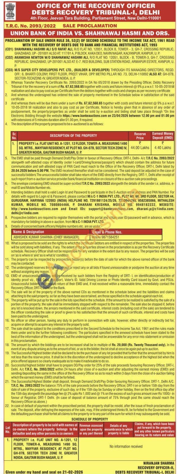 PROPERTY i.e. FLAT UNIT NO. A-1201, 12 FLOOR, TOWER-A, MEASURING 1490 SQ. MTRS., MAYFIAR RESIDENCY, AT PLOT NO. GH-07B, SECTOR TECH ZONE IV, GREATER NOIDA, GAUTAM BUDH NAGAR, U. P.