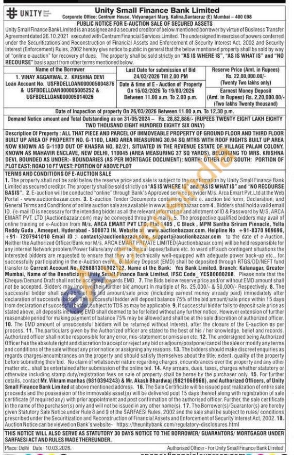 Description Of Property: ALL THAT PIECE AND PARCEL OF IMMOVEABLE PROPERTY OF GROUND FLOOR AND THIRD FLOOR BUILT UP AREA OF PROPERTY NO. G-1100, LAND AREA MEASURING 30.94 SQ MTRS WITH ROOF RIGHTS BUILT UP AREA NOW KNOWN AS G-110D OUT OF KHASRA NO. 82/21, SITUATED IN THE REVENUE ESTATE OF VILLAGE PALAM COLONY, KNOWN AS MAHAVIR ENCLAVE, NEW DELHI, 110045 (AREA MEASURING 37 SQ YARDS), BELONGING TO MRS. KRISHNA DEVI, BOUNDED AS UNDER:- BOUNDARIES (AS PER MORTGAGE DOCUMENT): NORTH: OTHER PLOT SOUTH: PORTION OF PLOT EAST: ROAD 10 FT WEST: PORTION OF ABOVE PLOT