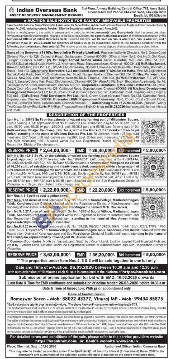 Item No. 1b: 46216 Sq Ft., or thereabouts of vacant site forming part of Millennium Square Layout, Approved by DTCP bearing letter No.11094/2011 LA2, comprised in Sy No.56/1A4A 56/1458, 56/1A58, 56/1824, 56/1828 and 56/282 situated in Kattawakkam Village, to the extent of 46,216 sq.ft., of saleable area and clearly demarcated, comprised within a large extent of 3.39 acres of land standing in the name of Mis, Inno Estates Pvt. Ltd. Boundaries: North: Land in Sy. Nos 56/1A4A part, 56/3 part & 56/1828 part. South Land in Sy Nos 56/181 part, 56/281 part. East 30 Wide Road running across Sy. Nos 56/1828 part. 56/182A part, West: Land in Sy. Nos 56/1A4A part, 56/1A6A part & 56/181 part. Situated within the Sub Registration District of Walajabad and Registration District of Kancheepuram