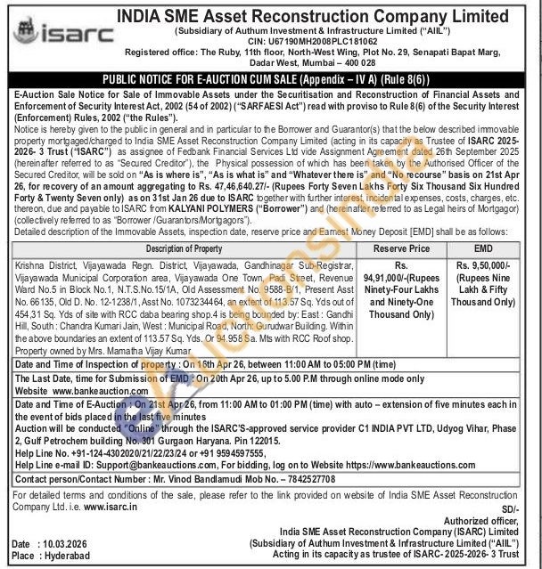 Krishna District, Vijayawada Regn. District, Vijayawada, Gandhinagar Sub-Registrar, Vijayawada Municipal Corporation area, Vijayawada One Town, Padi Street, Revenue Ward No.5 in Block No. 1, N.T.S.No. 15/1A, Old Assessment No. 9588-B/1, Present Asst No. 66135, Old D. No. 12-1238/1, Asst No. 1073234464, an extent of 113.57 Sq. Yds out of 454,31 Sq. Yds of site with RCC daba bearing shop.4 is being bounded by: East: Gandhi Hill, South: Chandra Kumari Jain, West: Municipal Road, North: Gurudwar Building. Within the above boundaries an extent of 113.57 Sq. Yds. Or 94.958 Sa. Mts with RCC Roof shop. Property owned by Mrs. Mamatha Vijay Kumar