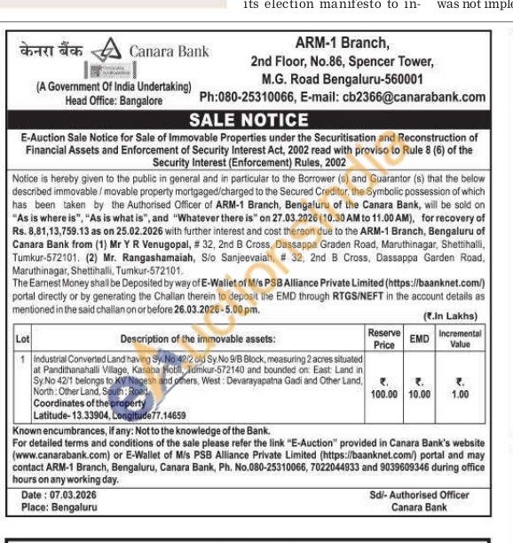 1 Industrial Converted Land having Sy. No.42/2 old Sy. No 9/B Block, measuring 2 acres situated at Pandithanahalli Village, Kasaba Hobli, Tumkur-572140 and bounded on East: Land in Sy No 42/1 belongs to KV Nagesh and others, West: Devarayapatna Gadi and Other Land, North: Other Land, South: Road.