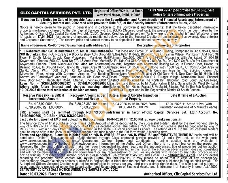 All That Piece And Parcel Of Land And Building, Comprised In Old S.No.41, New T.S. Nos.6997 & 8422, Block No.109 Of (Zamin Village, Mambalam And Part Of Paimash Nos.560, 567/8 And 584/92) Measuring With An Extent Of 804.19 Sq.Ft., Uds Out Of 8 Grounds 2109 Sq. Ft., Or 21309 Sq.Ft., (As Per Document 9 Grounds) Together With Apartment Bearing No.Gg. In Ground Floor, Having Its Carpet Area Of 1536 Sq.Ft., Along With 1500 Sq.Ft., Of Constructed Area In Mezzanine Floor, Along With Common Area In The Building Known As "Ramaniyam Aarudra", Situated At Old Door No.4, New Door No.15, Habibullah Road, T.Nagar, Chennai-600 017, T.Nagar Village, Mambalam Taluk, Chennai District And Bounded On The North By: Habibullah Road, South By: Giri Road, , East By: Land Belongs To Mr.Abdur Rahim & Mrs. Sarasvathi Gir, West By: Land Belongs To Mr. Kishna Prasad & Mr.Sastri, Situated Within The Sub-Registration District Of T.Nagar And In The Registration District Of South Chennai.