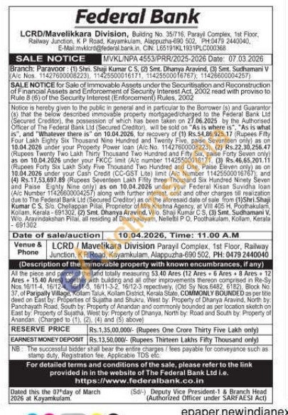 All the piece and parcel of the land totally measuring 53 tally measuring 53.40 Ares (12 Ares 6 Ares 8 Ares 12 Ares 15.40 Ares) together with building and all other other improvements thereon comprised in Re-Sy No. 16/11-4, 16/12-4, 16/11-3, 16/11-3-2, 16/12-3 repectively, (Old Sy Nos. 6482. 6182), Block No. 37, of Paripally Village, Kollam Taluk, Kollam District, Kerala Stato, COMMONLY BOUNDED per lite deed on East by: Properties of Sujatha and Shukru. West by Property of Dhanya Aravind, North by Panchayath Road, South by: Property of Anandan and commonly bounded as per location sketch on East by: Property of Sujatha, West by: Property of Dhanya, North by: Road and South by Property of Anandan. (Charged to (1), (2), (4) and (5) abovel