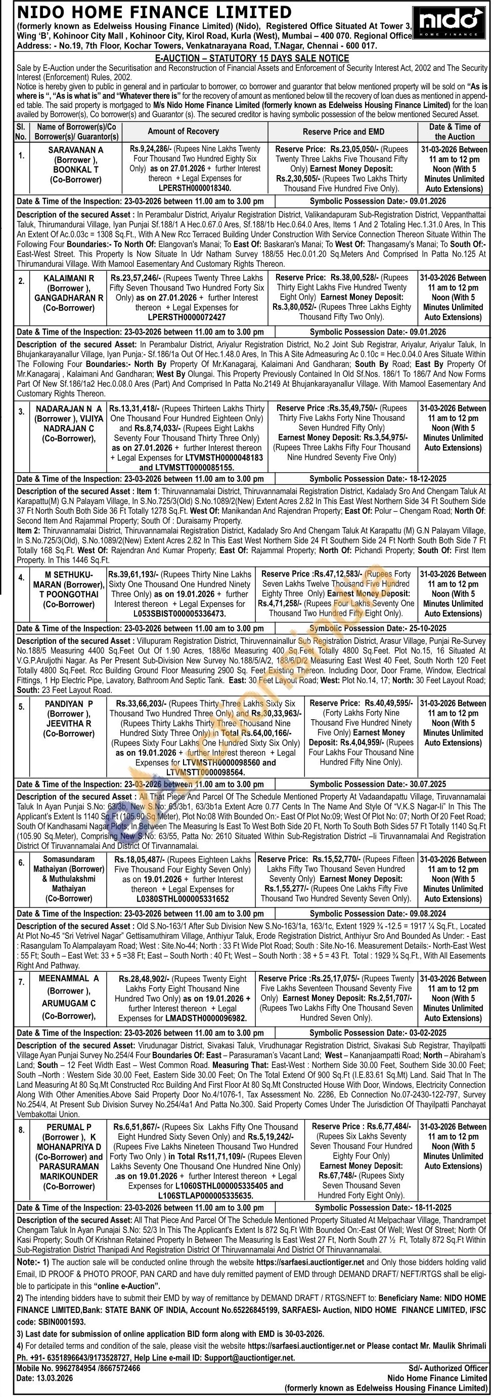 Description of the secured Asset: Old S.No-163/1 After Sub Division New S.No-163/1a, 163/1c, Extent 1929%-12.5 = 1917% Sq.Ft., Located At Plot No-45 "Sri Vetrivel Nagar" Gettisamuthiram Village, Anthiyur Taluk, Erode Registration District, Anthiyur Sro And Bounded As Under: - East : Rasangulam To Alampalayam Road; West: Site. No-44; North: 33 Ft Wide Plot Road; South: Site. No-16. Measurement Details:- North-East West : 55 Ft, South-East Wet: 33+5=38 Ft; East-South North: 40 Ft, West - South North: 38+5=43 Ft. Total: 1929% Sq.Ft., With All Easements Right And Pathway.