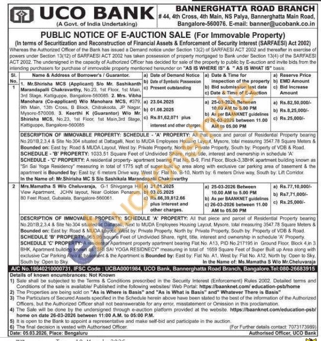 DESCRIPTION OF IMMOVABLE PROPERTY: SCHEDULE 'A' PROPERTY: All that piece and parcel of Residential Property bearing No.20/18.2.3.4 & Site No 304 situated at Dattagalli, Next to MUDA Employees Housing Layout, Mysore, total measuring 3547.78 Square Meters & Bounded on: East by: Road & MUDA Layout, West by: Private Property, North by: Private Property, South by: Property of VDB & Road SCHEDULE 'B' PROPERTY: 965.96 square Feet of Undivided Share, right, title, interest and ownership in schedule 'A' Property SCHEDULE 'C' PROPERTY: A residential Apartment property apartment bearing Flat No. A13, PID No.217195 in Ground Floor, Block 4 in 3 BHK, Apartment building known as "SRI SAI YOGA RESIDNECY measuring in total of 1659 Square Feet of Super Built up Area along with exclusive Car Parking Area at basement & the Apartment is Bounded by: East by. Flat No. A1, West by: Flat No. A12, North by: Open to Sky. South by Open to Sky