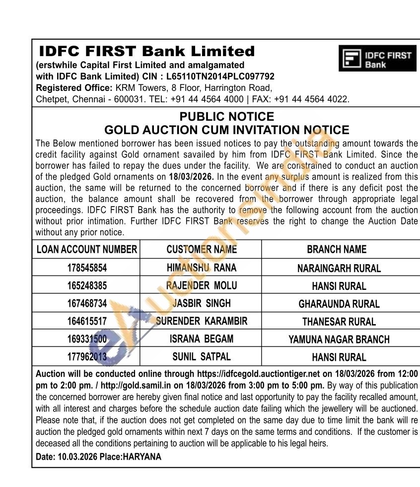 IDFC First Bank Ltd Gold Auctions Auction in Chennai