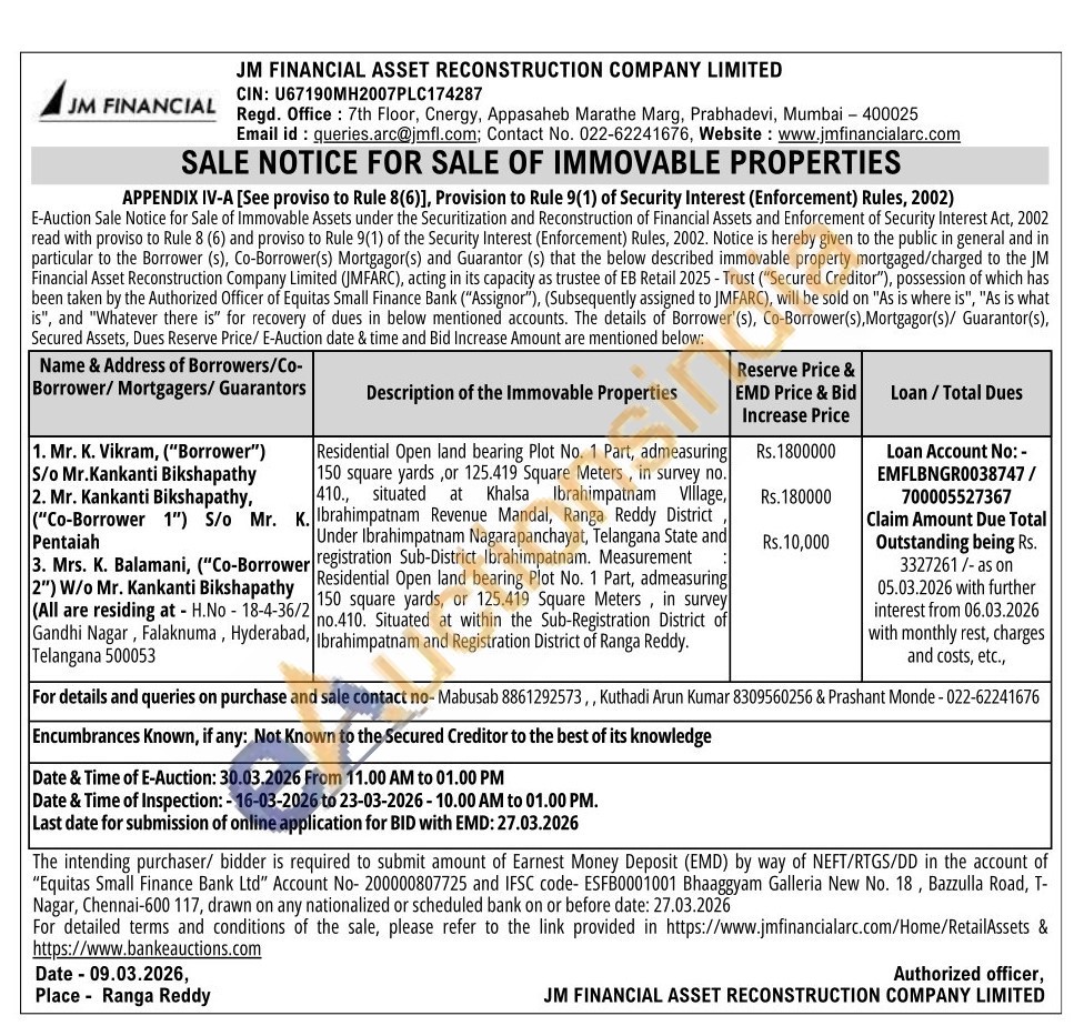 Residential Open land bearing Plot No. 1 Part, admeasuring 150 square yards, or 125.419 Square Meters, in survey no. 410., situated at Khalsa Ibrahimpatnam Village, Ibrahimpatnam Revenue Mandal, Ranga Reddy District, Under Ibrahimpatnam Nagarapanchayat, Telangana State and registration Sub-District Ibrahimpatnam. Measurement Residential Open land bearing Plot No. 1 Part, admeasuring 150 square yards, or 125.419 Square Meters, in survey no.410. Situated at within the Sub-Registration District of Ibrahimpatnam and Registration District of Ranga Reddy.